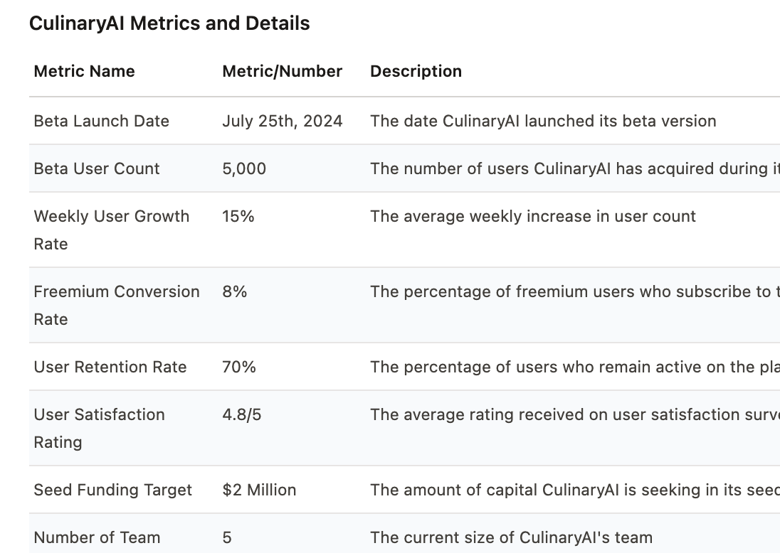 Output metrics & data from conversations effectively with structured tables.